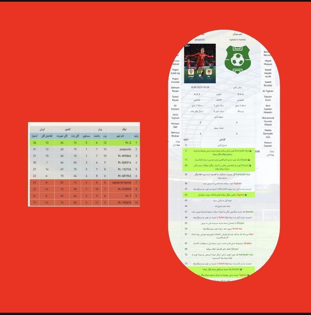 فوتبال ترکیب، بازی مربیگری فوتبال آنلاین به این جهان فوتبال رایگان بپیوندید مکان تبلیغ شماست راهنمای سایت انتخاب سیستم و ترکیب لیگ و مسابقه گروه و نامه تمرینات لیگ برتر ایران مجموع میزبان مهمان رتبه اسم تیم امتیاز تفاضل گل تعداد بازی برد باخت تساوی گل زده گل خورده تعداد بازی برد باخت تساوی گل زده گل خورده تعداد بازی برد باخت تساوی گل زده گل خورده 1 Sepahan FC 27 10 13 8 2 3 16 6 5 2 2 1 5 4 8 6 0 2 11 2 2 Persepolis FC 25 8 14 6 1 7 15 7 8 3 0 5 9 3 6 3 1 2 6 4 3 Chadormalu SC 24 3 14 6 2 6 18 15 8 4 0 4 8 3 6 2 2 2 10 12 4 Esteghlal FC 22 7 13 5 1 7 18 11 6 3 0 3 11 7 7 2 1 4 7 4 5 Tractor Sazi 21 10 13 5 2 6 18 8 7 3 1 3 10 5 6 2 1 3 8 3 6 Kheybar Khorramabad 20 1 14 5 4 5 13 12 8 3 1 4 9 7 6 2 3 1 4 5 7 Gol Gohar 20 0 14 5 4 5 12 12 8 3 3 2 7 9 6 2 1 3 5 3 8 Fajr Sepasi 18 0 14 4 4 6 15 15 6 2 3 1 5 8 8 2 1 5 10 7 9 Malavan 18 -3 13 4 3 6 8 11 7 3 2 2 6 9 6 1 1 4 2 2 10 Aluminium Arak 15 -5 14 4 7 3 8 13 6 2 2 2 4 3 8 2 5 1 4 10 11 Paykan 14 -4 14 3 6 5 11 15 6 1 2 3 4 5 8 2 4 2 7 10 12 ZOB Ahan 13 -2 13 2 4 7 9 11 7 2 2 4 4 4 6 1 2 3 5 7 13 Foolad FC 13 -3 14 2 5 7 5 8 7 2 3 2 2 3 7 0 2 5 3 5 14 Esteghlal Khuzestan 13 -8 14 3 7 4 10 18 7 2 3 2 5 6 7 1 4 2 5 12 15 Shams Azar Qazvin 11 -3 13 1 4 8 10 13 7 0 3 4 8 11 6 1 1 4 2 2 16 Mes Rafsanjan 8 -11 14 1 8 5 8 19 6 1 2 3 4 6 8 0 6 2 4 13